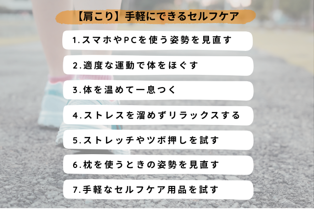 肩こりの原因が何となく見えてきたら、次は対策となる簡単なセルフケアを試してみましょう。
