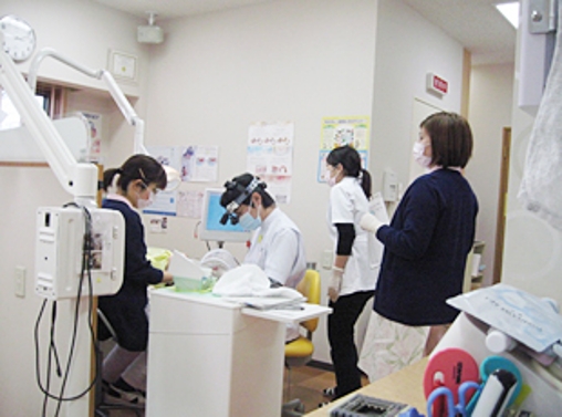 治療では義歯・インプラント治療を得意としており、院内もそれに伴った専用の設備が設けられています。義歯は院長の指示の下、スタッフが一丸となり患者様の対応を行っており、丁寧な診察と細かい微調整によるフィット感の良さから患者様には大変ご好評のようです。インプラント治療では専用ユニットでスタッフ一同が万全の体勢のなか手術を行います。患者様の安全確保として麻酔管理、脈拍管理、衛生管理は勿論、手術専用ライトにはカメラが取り付けられており、頭上のプラズマモニターでは手術の進行状況がライブ映像で放映されています。ドクターやスタッフはその映像から手術の状況を把握し、安全かつ敏速に手術を進行していきます。当院では1本から全顎までの手術が可能ですが、特殊な症例や治療が必要な場合は、速やかに基幹病院への紹介も行っています。女性や小児歯科では、主に副院長が治療に当たっています。特に小児歯科では、ご自身も母親であることから子供の目線に立った「やさしい治療」を心掛けています。