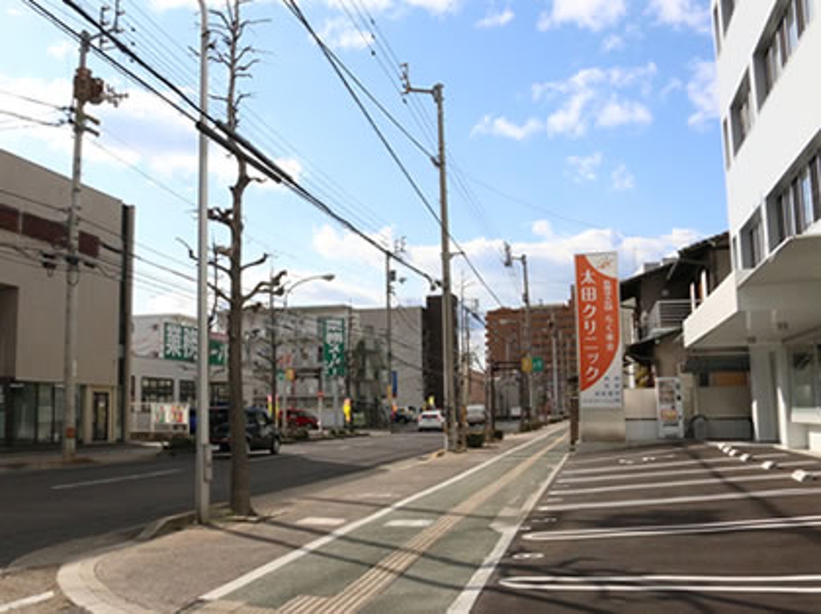 建物は白を基調にし通り沿いのオレンジの看板が目印です。駐車場も9台完備していますので、お車での通院も安心です。
