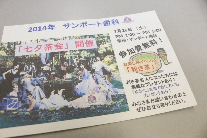 日ごろお世話になっております皆さまに、7月26日の13時から17時まで行っている「七夕茶会」のご案内をお送りいたしました。「利き茶」イベントなども行っています♪また、「ゆかた」を着てこられた方にはプレゼントも?お誘いあわせの上、ぜひお立ち寄りください。