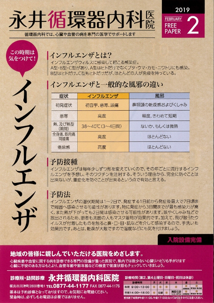 毎月発行しているフリーペーパー2月号を発行しました。今月はこの時期に気をつけてほしい「インフルエンザ」について特集しています。医院内においておりますので、お気軽にごらんください。