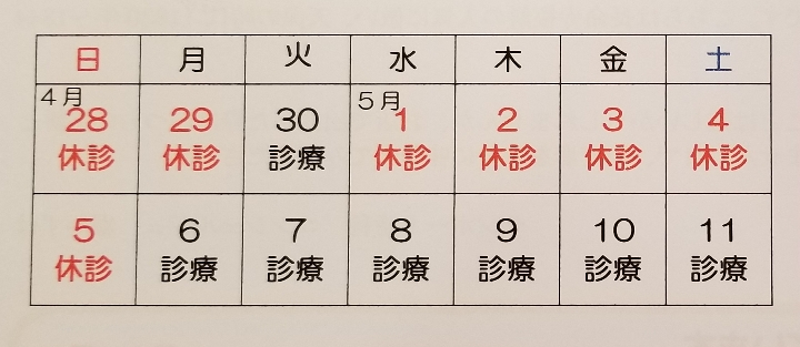 ゴールデンウイーク期間中の診療のお知らせです。4月27日(土)までは通常通り診療します。4月30日(火)・5月6日(月)は終日診療します。5月7日(火)以降は通常通り診療します。ご不便おかけしますが、よろしくお願いします。