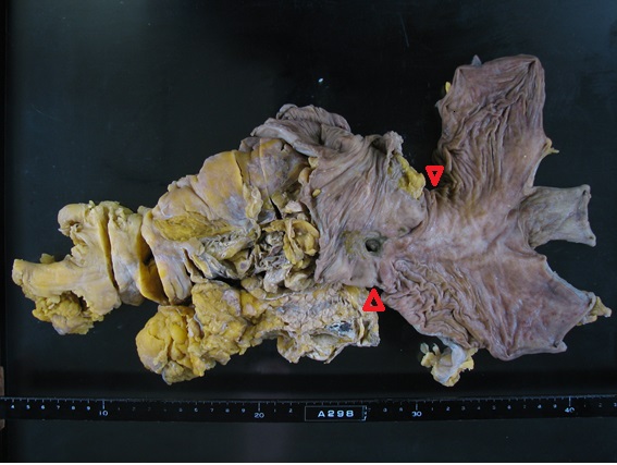 10年以上前に胃部分切除術がされており、吻合部肛門側の十二指腸に潰瘍・穿孔があり、これによる腹膜炎・敗血症性ショックで死亡した。