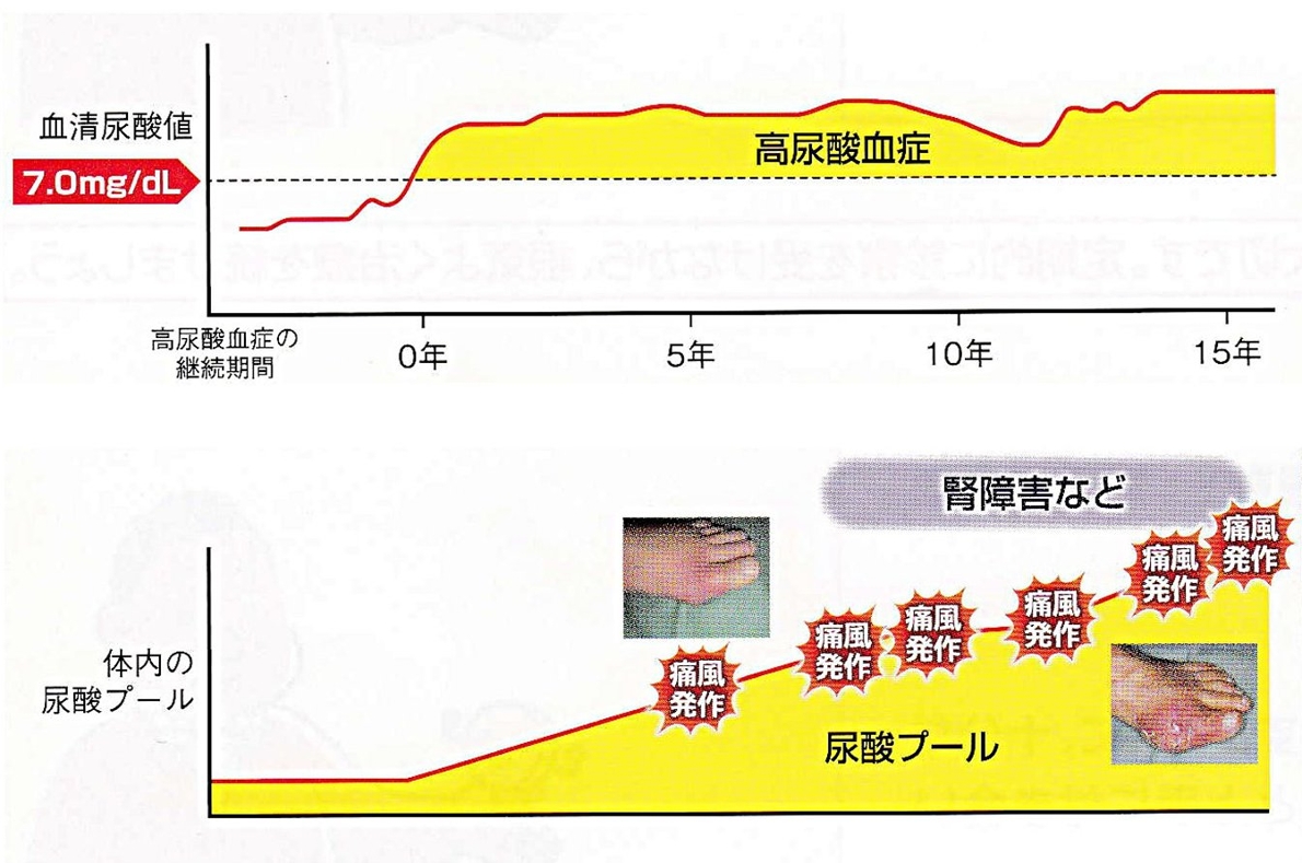 ◇高尿酸血症(血液中の尿酸値が高い状態)が続いていると、体内に尿酸が蓄積(プール)されていきます。
