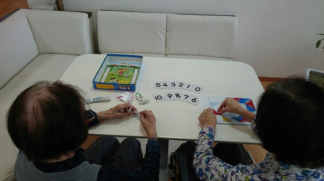 皆様こんにちは!!W(^Д^)w ずいぶん夜風が心地よくなった今日この頃ですよね♪♪もうすぐ~秋ですね~~ 暑さから少し開放されてきて、頭の中もスッキリされてきた!? ところで、利用者様に“頭の体操“をして頂きました。 毎度お馴染み“算数セット“を使っての計算問題、型合わせ等、自分の得意分野の物からの挑戦です!! いつも「手先が不器用なの・・・・(泣)」とおっしゃている方も少し大きめの図形を使い問題なく全部クリアされ、イイ笑顔が見られました(笑) 他の皆様にもお声かけして、どんどん頭脳の活性化をしてもらいたいと思います!!