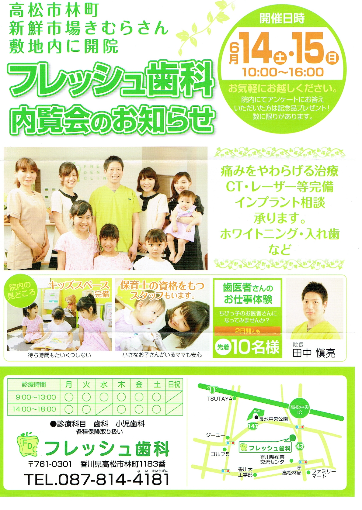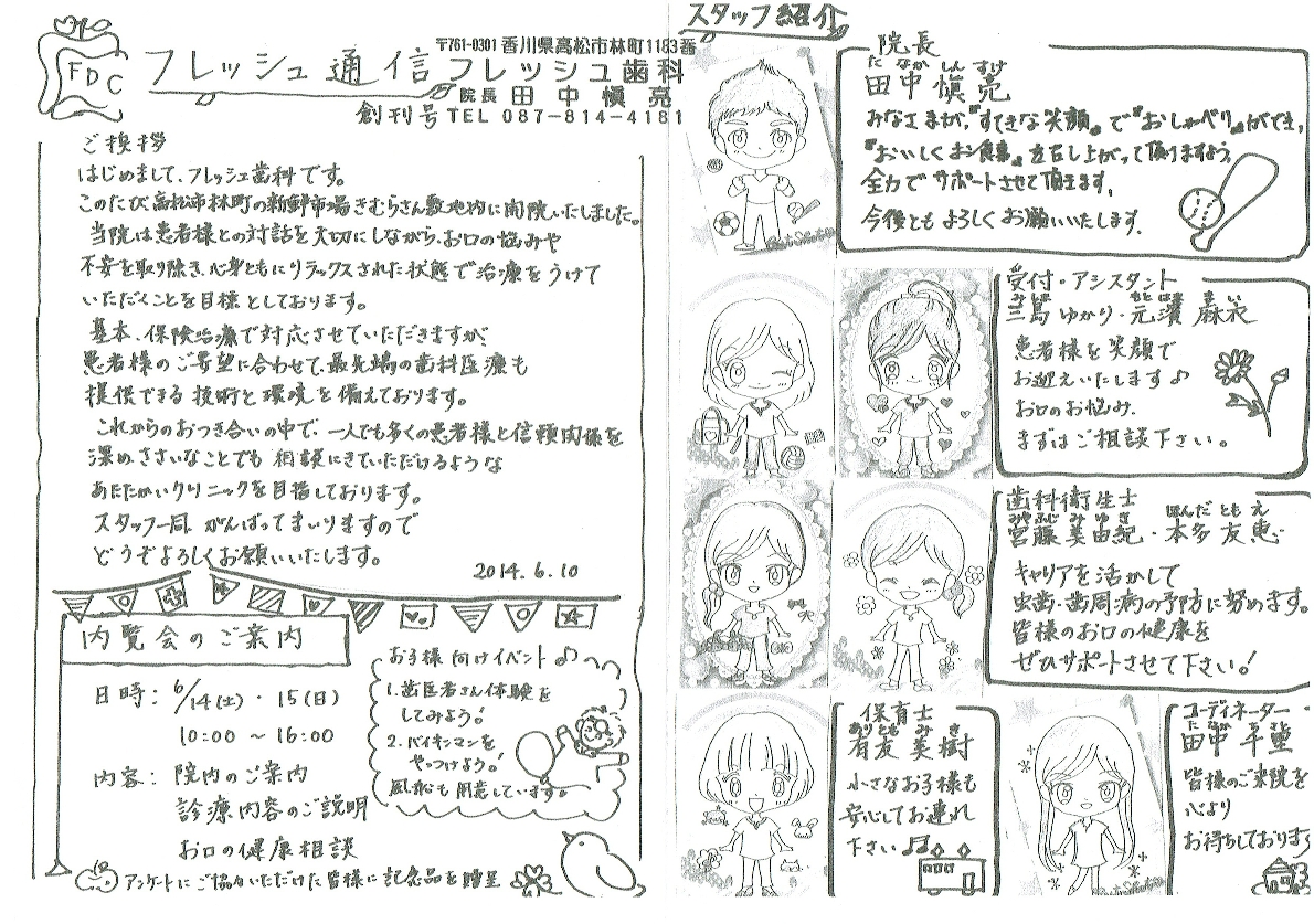 いよいよ明日から2日間内覧会です。ちびっ子歯医者さん体験の白衣も届きました!未来の歯医者さんになってくださいね!お子様の白衣姿をぜひ記念撮影してください。内覧会の準備で大忙しの中、フレッシュ歯科のスタッフの皆さんが『フレッシュ通信』を作ってくれました。みなさんもぜひ読んでくださいね。手作りでご用意しておりますので、内覧会に気軽にお立ち寄り下さい!