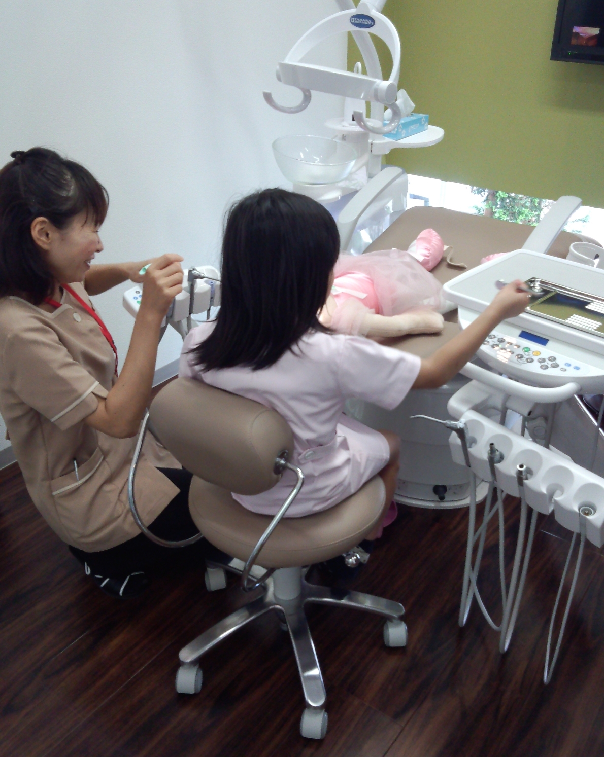 ちびっ子歯医者さん体験では、ちびっ子たちがピンクや白の白衣を着て、実際の器材に触れながら、興味津々なご様子でした。まるでキッザニアの様・・・