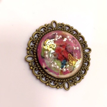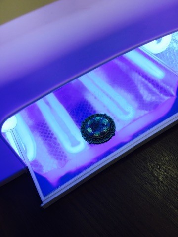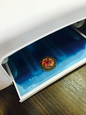 レジン液やビーズやお花柄のイラストなどを入れてUVライトで固めます!