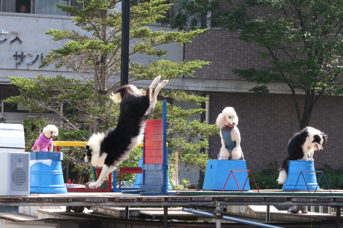 ドッグショーではワンちゃんが柵越えや平均台などにチャレンジ!
