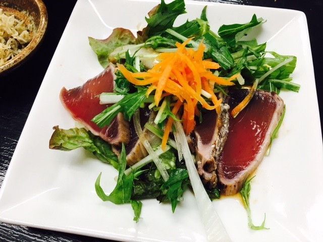 本日のかつおにも、水菜や新玉ねぎやニンジンをたっぷり乗せ、色鮮やかに仕上げています。