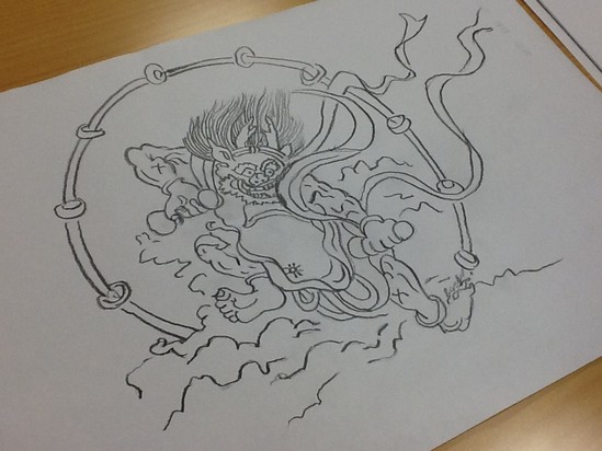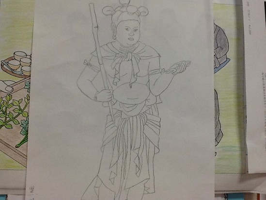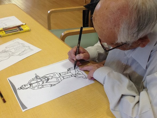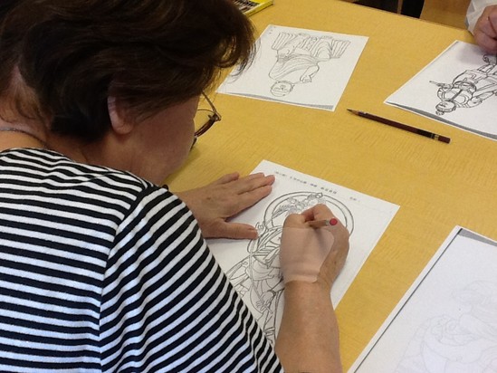 下絵に紙をのせて、透けた線を鉛筆や筆ペンを使いなぞっていきます。