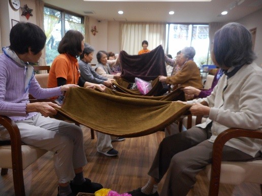 ひざ掛けで力を合わせ、花を送っていきます。