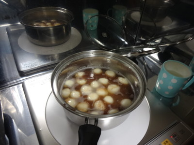 お餅をこねた後は鍋にあずきを入れて煮詰めます