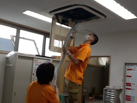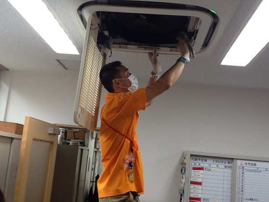 夏を迎える前の大仕事 館内のエアコン清掃に奔走中のところをパシャリ