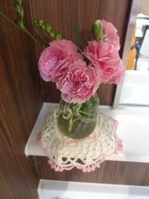 花瓶の下あるレース編みコースタ-もとある職員さんの手作りです