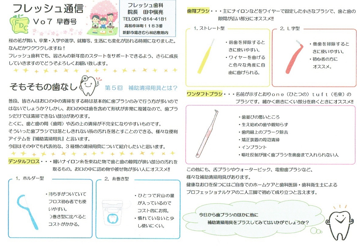 3月も半ばにさしかかり、まだ寒い日が続きますが、少しずつ春の足音が聞こえて来る今日この頃です。三寒四温で、目の前まで春が近づいていますね。さて、フレッシュ通信7号早春号を発行いたしました。テーマは、歯ブラシ以外のデンタルグッズの紹介です。歯ブラシだけでは、すべての汚れを落ときれないというのも事実です。その補助として、様々なグッズがありますので、日頃のケアの参考にしてくださいね。