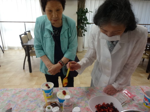 抹茶味と苺味がありトッピングにフルーツと餡子を用意しました