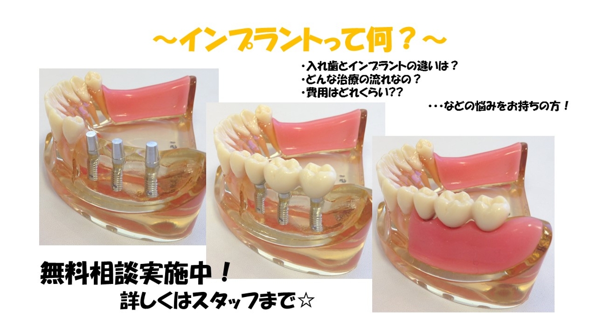 インプラント・・・皆さんも一度は耳にしたことがあると思います。最近ではTVやネットでも取り上げられたりしているので、「インプラント」という言葉は認知されてきましたよね!でも、インプラント治療ってどんなことをするのか、知っていますか?誰でもできるの?どんな治療が必要なの?費用も気になるなぁ…そんな悩みを解決します!ただいまインプラントの無料相談実施中です!この機に、分からないことや知りたいことなどございましたら、お気軽にご相談ください。