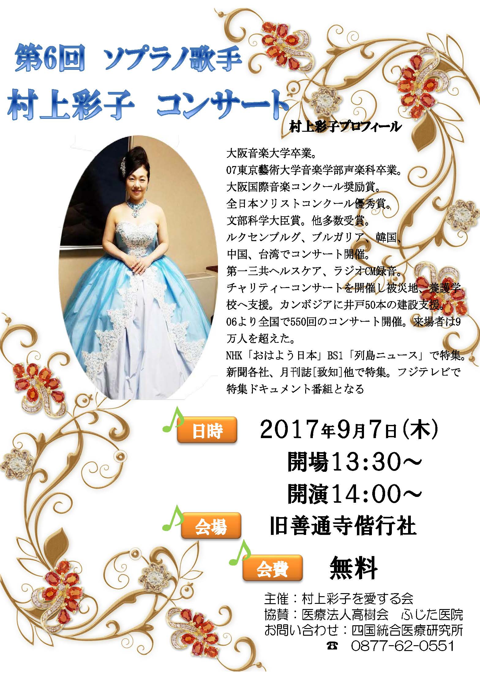 明日、9月7日(木)の13:30より、旧善通寺偕行社にてソプラノ歌手 村上彩子さんのコンサートが開催されます。