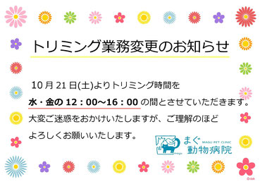 このような事情により、10月21日よりトリミングのご予約を水曜・金曜の12:00~16:00のみとさせていただくことになりました。