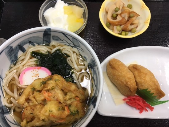 今日の昼食は、『かき揚げうどんといなりずし』でした。うどんの中にかき揚げを入れるとかき揚げがダシを吸って美味しくなります。いなりずしも付いていたので、お腹がいっぱいになりました。入居者様からうどんを食べたいなとリクエストがあったばかりだったので、偶然にもメニューにうどんがあって、喜んだことでしょう。