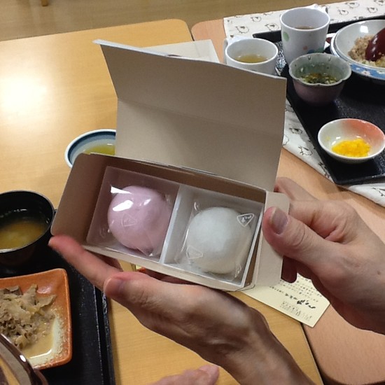 夕食には感謝の心ばかりの某有名和菓子店の紅白お饅頭です。