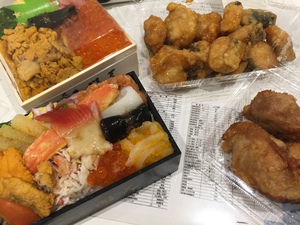 海鮮丼、ザンギなど残り僅かではありましたが、ゲットできました!しかも閉店間際のためおおよそ半額です(°▽°)