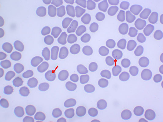 (写真は当症例の血液塗抹です。赤血球内にバベシア虫体を認めます。)