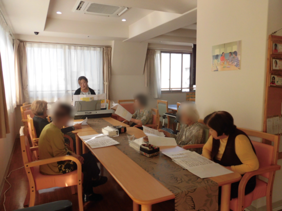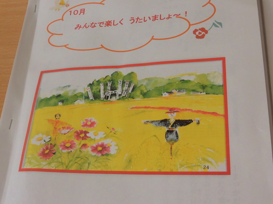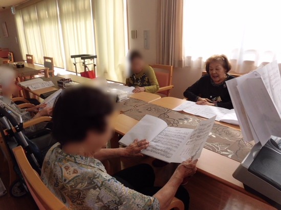 今日の午後14時から音楽教室が開催されました。5名の入居者様が参加されました。1時間も前から待っていた入居者様もいらっしゃいました。先生が到着すると待っていましたと言わんばかり、スタッフと共に6階へあがっていきました。秋の歌をたくさん、楽しく歌いました。