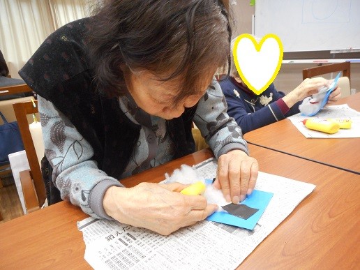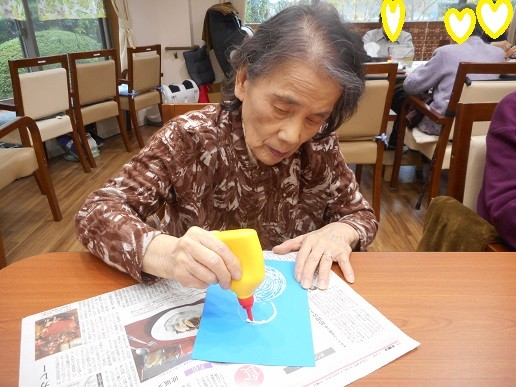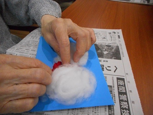 色画用紙に、ボンドを雪ダルマの形にクルクルと塗っていきます(^^)