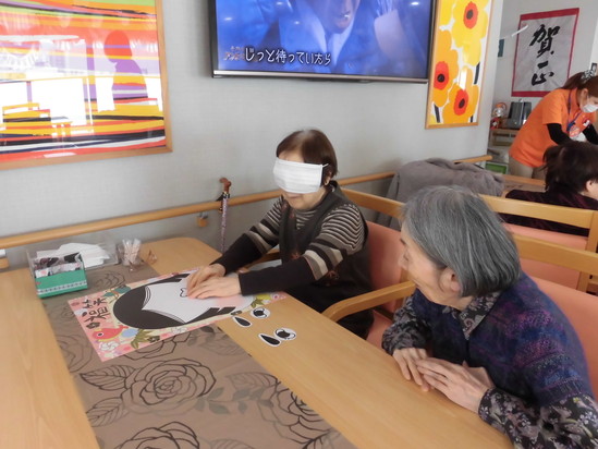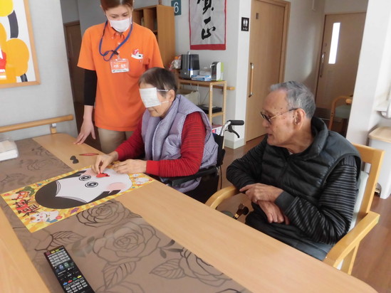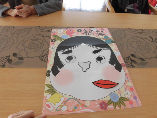 今日の日曜レクは、福笑いをしました。6階のレストランにて、8名の入居者様が参加されました。テーブルの上に広げた顔の絵に最初は、キレイに仕上げようとされていましたが、目や口と顔のパーツを置いていくうちに笑いが増え、面白い顔に仕上がりました。笑いで元気を呼び込みましょう。