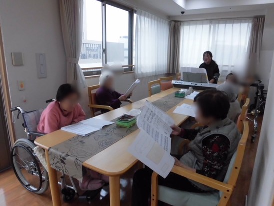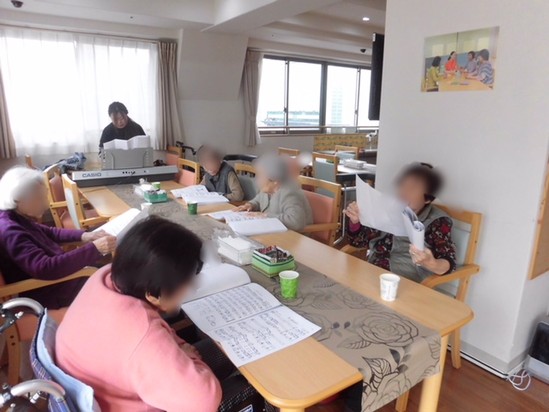 今日は、ハルカルチャーの音楽教室が行われました。今日の歌は、『一月一日』『雪国』『たき火』など、お正月にまつわる歌を歌いました。「全部知っている歌だったわ」と笑顔で喜んでいらっしゃいました。5名の入居者様が参加されました。