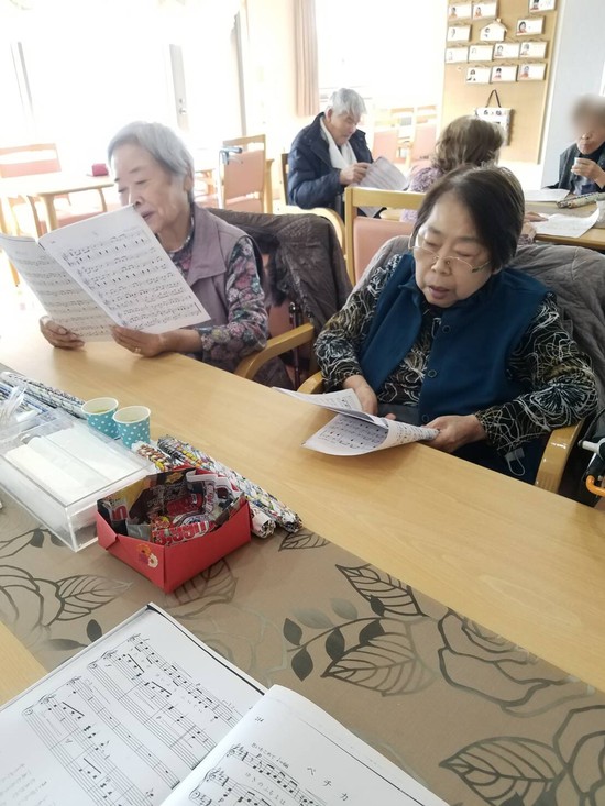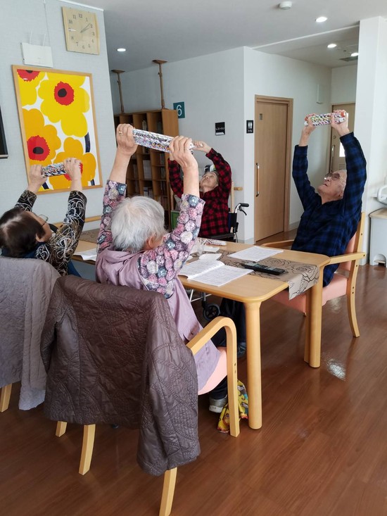 2月初めの日曜レクは、音楽レクを行いました。8名の入居者様が参加されました。棒を使って、からだを軽くほぐす体操をはじめにしました。その後、『雪、村祭、たきび、あめふり、ふるさと』の歌を歌いました。懐かしい歌なので、笑顔で大きな口を開けて歌われていました。