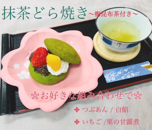 事前に焼いたどら焼きの皮に、つぶあん、白あん、栗の甘露煮、いちご、ホイップクリームをお客さまと一緒にトッピングし、それと一緒に梅こぶ茶を召し上がっていただきました。