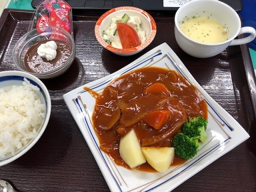今日のメニューは煮込みハンバーグです。 エンターさんのご配慮により ちょこっとチョコのサービス付きです。 ボリューム満点のランチでしたが、たくさん召し上がって いただけたようです
