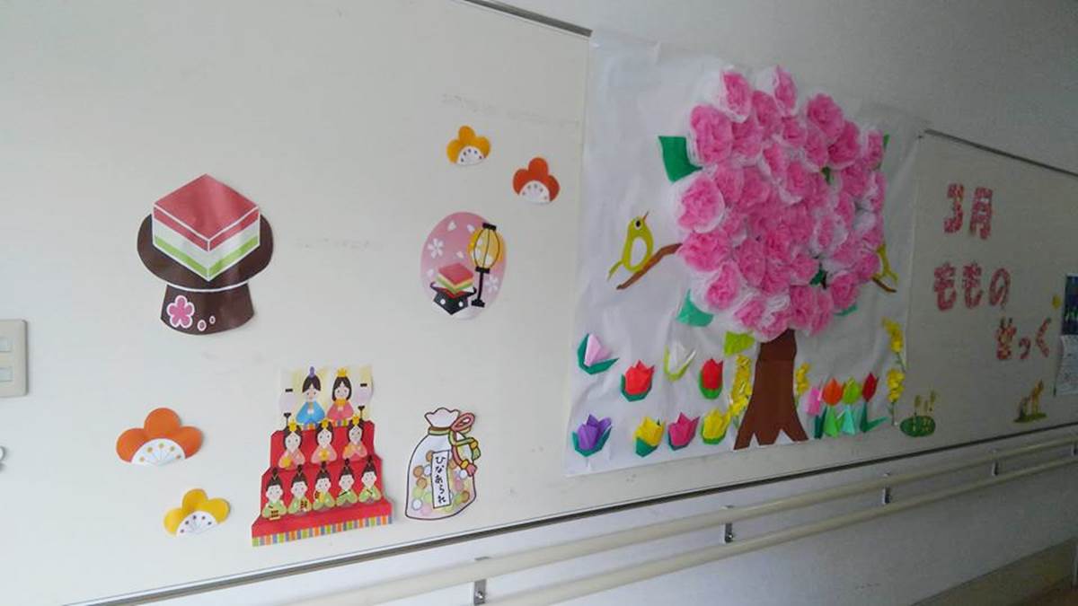 病院内の入り口もひな祭りの飾りつけを行っています。