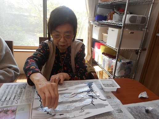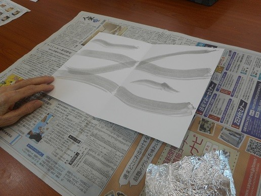 今度は、アルミホイルに墨汁をつけて、幹や枝を描いていきます。