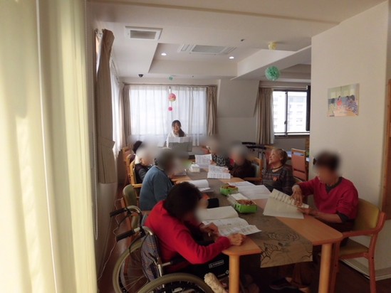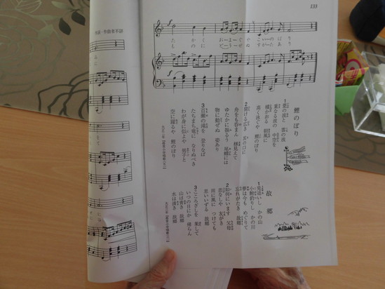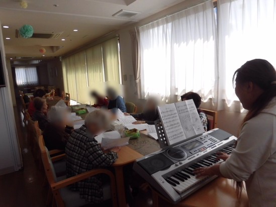 本日、音楽教室が6階レストランにて14時から行われました。5月の『こいのぼり』『上を向いて歩こう』『黒田節』を歌われていました。8名の入居者様が参加されました。声をだしていると気持ちが明るくなってきますね。