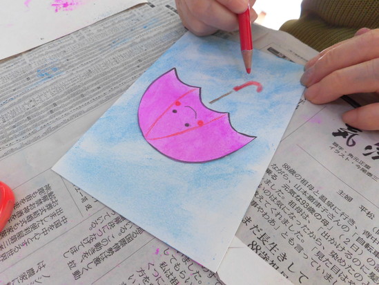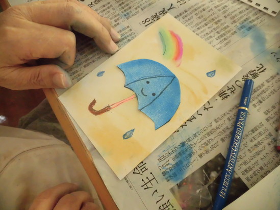 今日のパステルアートは、そんな憂鬱な気分を吹き飛ばしてくれる様な、かわいい傘を描きました。入居者様もとてもかわいい傘が仕上がりました。