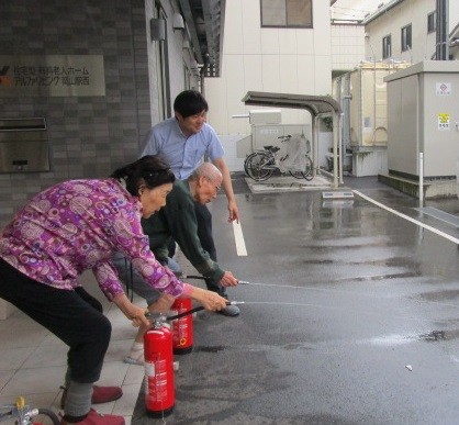 最後に水消火器を使った取り扱いから消火訓練を行いました。