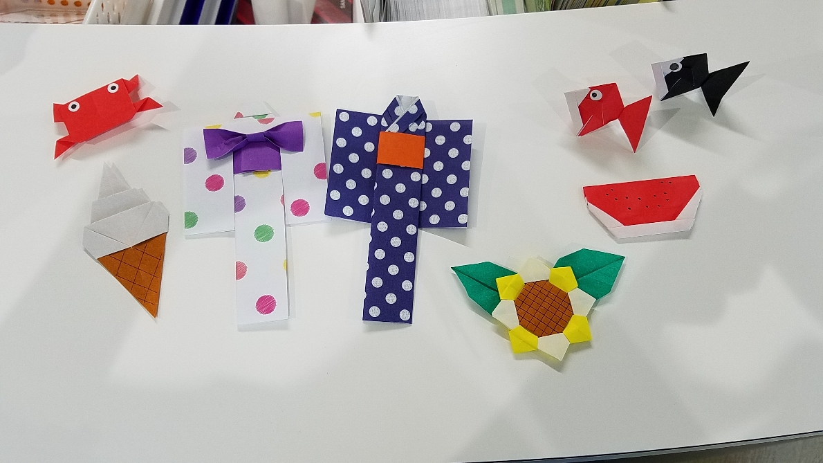 こんにちは。いきなりですが毎日『暑い』しか言っていません(笑)普段運動をしない私は暑さで体力を奪われています( ´△`)かといって運動をしようとは思いません(笑)不健康まっしぐらです...毎日暑いですが、目だけでも涼を感じれればと、夏の風物詩を折り紙で折りました(*´∀`)♪かわいく仕上がりました!しばらく飾ってますので来院の際は見てください(*^^*)そして褒めてください(*>∇<)ノ皆様も周りにある涼を見つけてみて、夏を快適に過ごしてくださいね☆