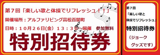 あなぶき みちこさんと百間 マチ子さんの豪華出演ということでチケットを作ってみました。「歌と体操でリフレッシュ」はチケット不要の自由参加イベントなのでチケットの配布はしないのですが、せっかく作ったのでこちらで公開