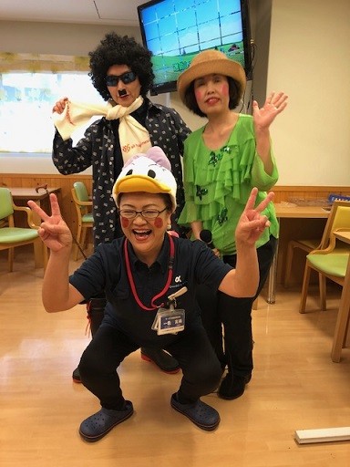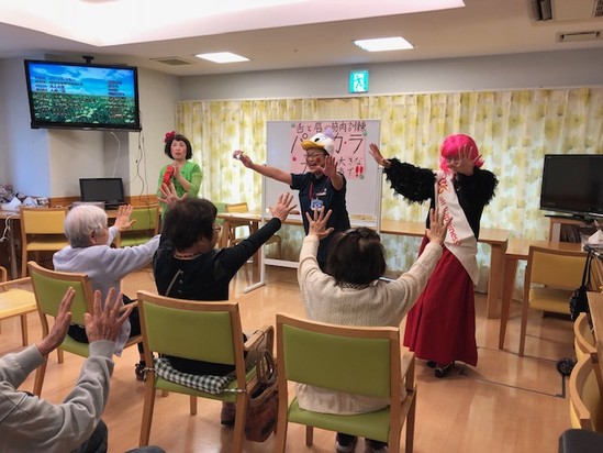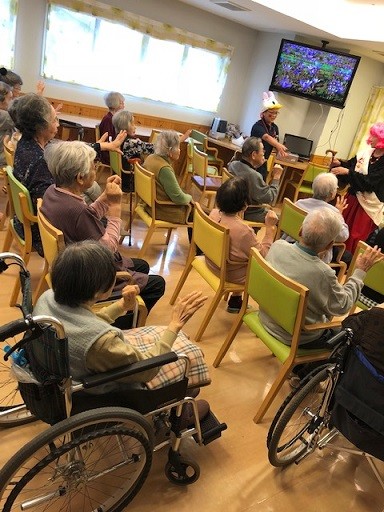 クイズ→菊池和子さんの体操にひきつづき「高校三年生」「麦畑」「しあわせなら手をたたこう」をみんなで大合唱 いつものメンバーにもう一人加わり、はいチーズ 百間町にはこんなにも立役者がそろっています 30分という短い時間でしたが(サービス時間の関係上) 入居者の中にはもう少しやってほしいとアンコール希望の 方もいらっしゃり、大盛況ののち終了しました