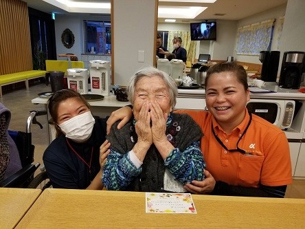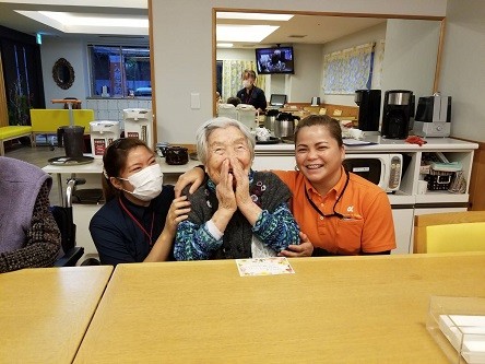 今月92歳のお誕生日を迎えられたN様です。 留学生の二人と一緒に笑顔でにっこり