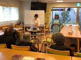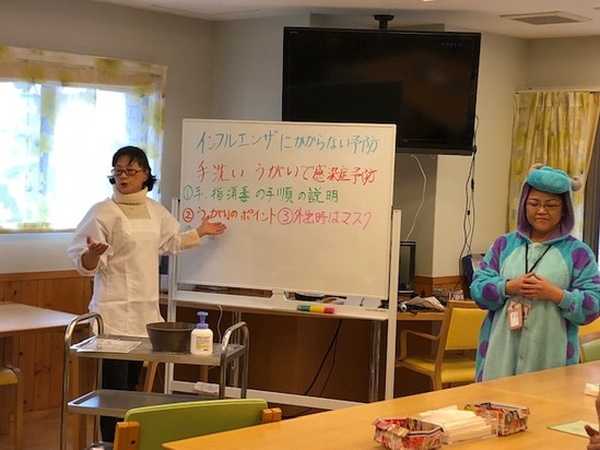 今日は、これからピークを迎えるインフルエンザの予防策として、 効率的な手洗いやうがいの仕方などを勉強しました ニュースではすでに流行が本格化して注意報レベルに達しているようです。 その他の感染症からも身を守る為に みなさんで取り組むことの大切さが伝わってきます。
