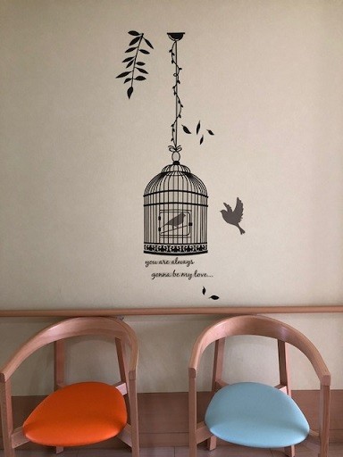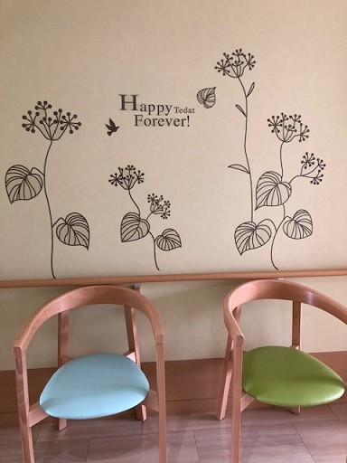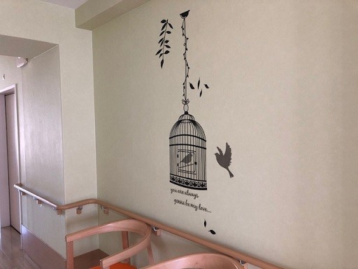 すっきりとした壁面も気持ちのいいものですが、 たまには気分を変えて おしゃれな感じもまたいいものです。 フロアの壁に留学生ががんばって貼ってくれました~ 早速、9階にお住いの家族の方から ”雰囲気が変わってとてもいいですね!” とお褒めの言葉をいただきました