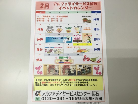 さて、2月のデイサービスのイベントのご案内です。