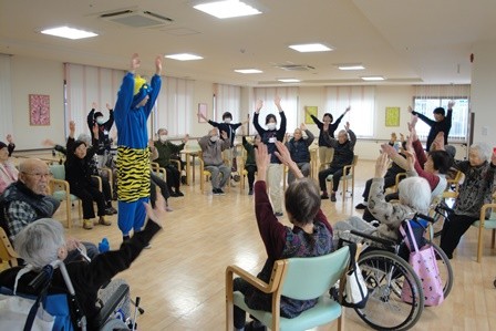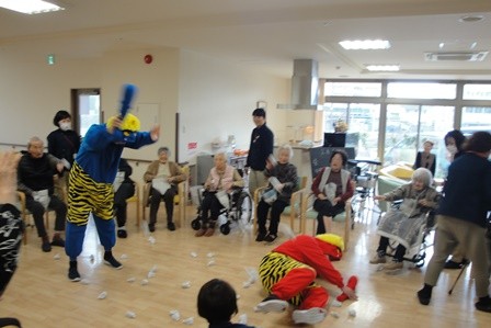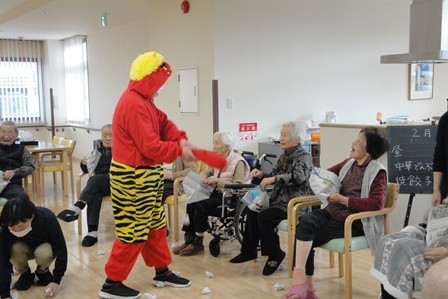 赤鬼、青鬼さんを囲んで入居者の皆様と豆まきをしたり