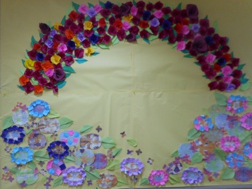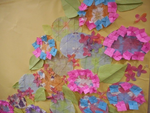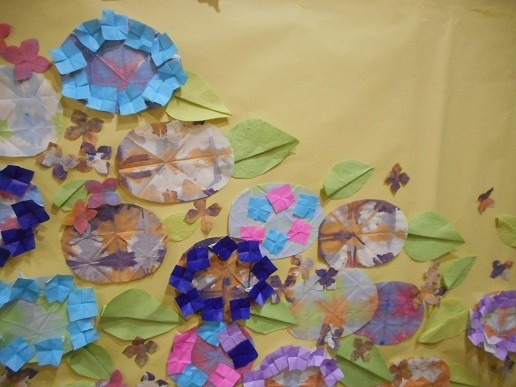 半紙に絵の具で色付けし、折り紙であじさいを折りました(^^♪