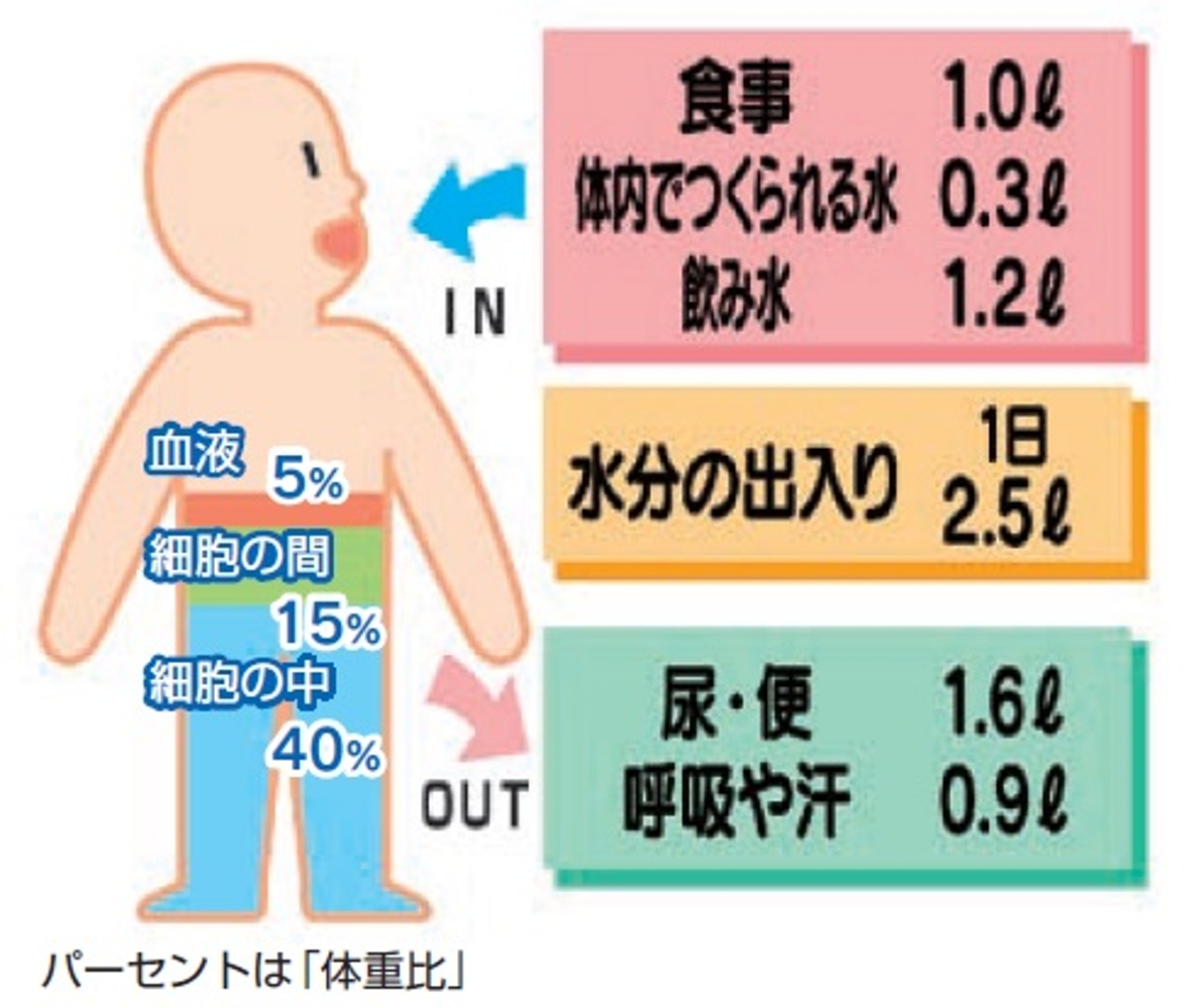 これには根拠があり、人間の体の60~70%は水分でできていて、1日の生活で尿や汗で約2~2.5リットルの水分が出ていくとされています。